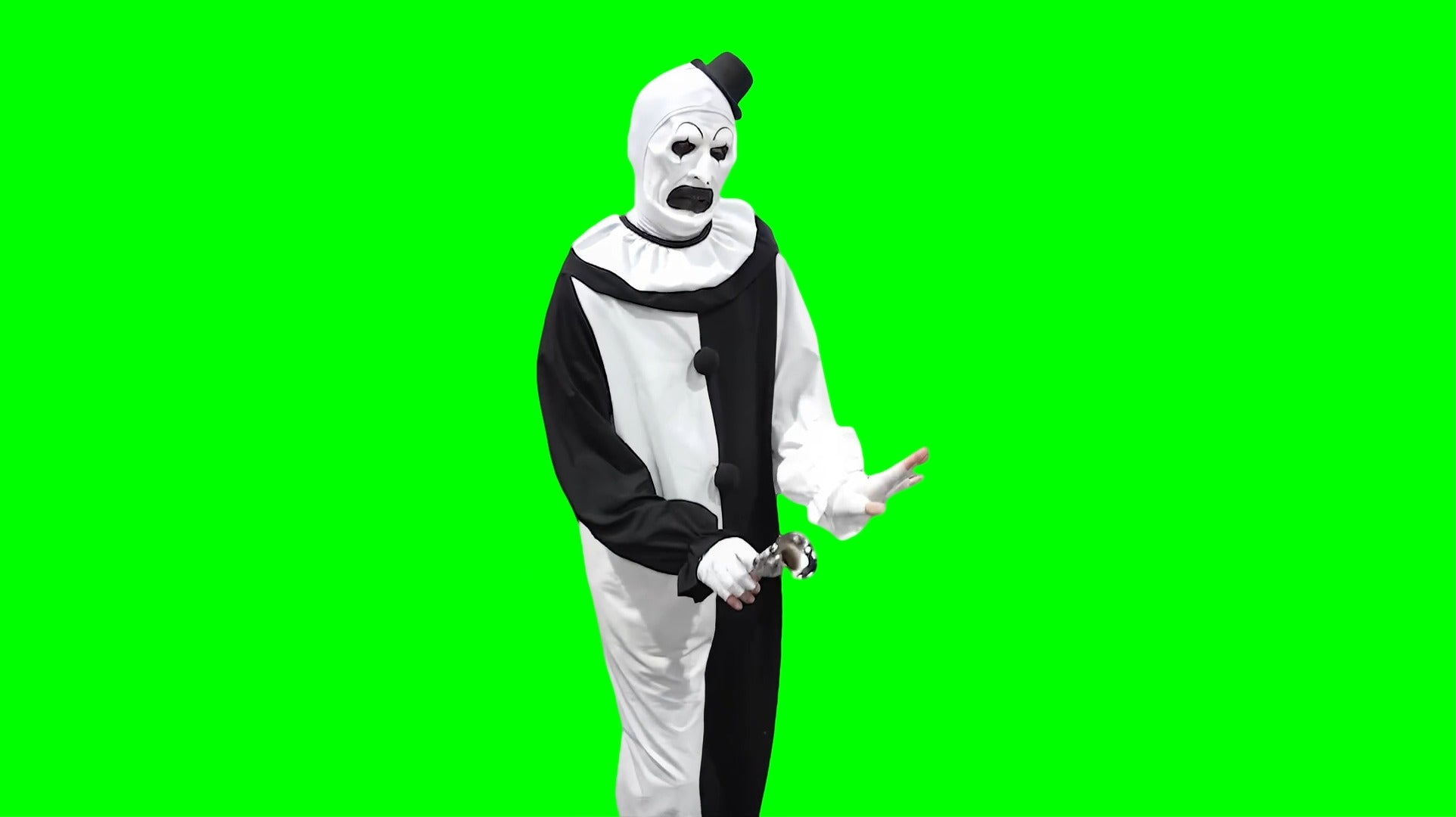 Green Screen Meme Template of Art the Clown saying No with his body language and facial expressions and then running away when asked if he's a father of a child