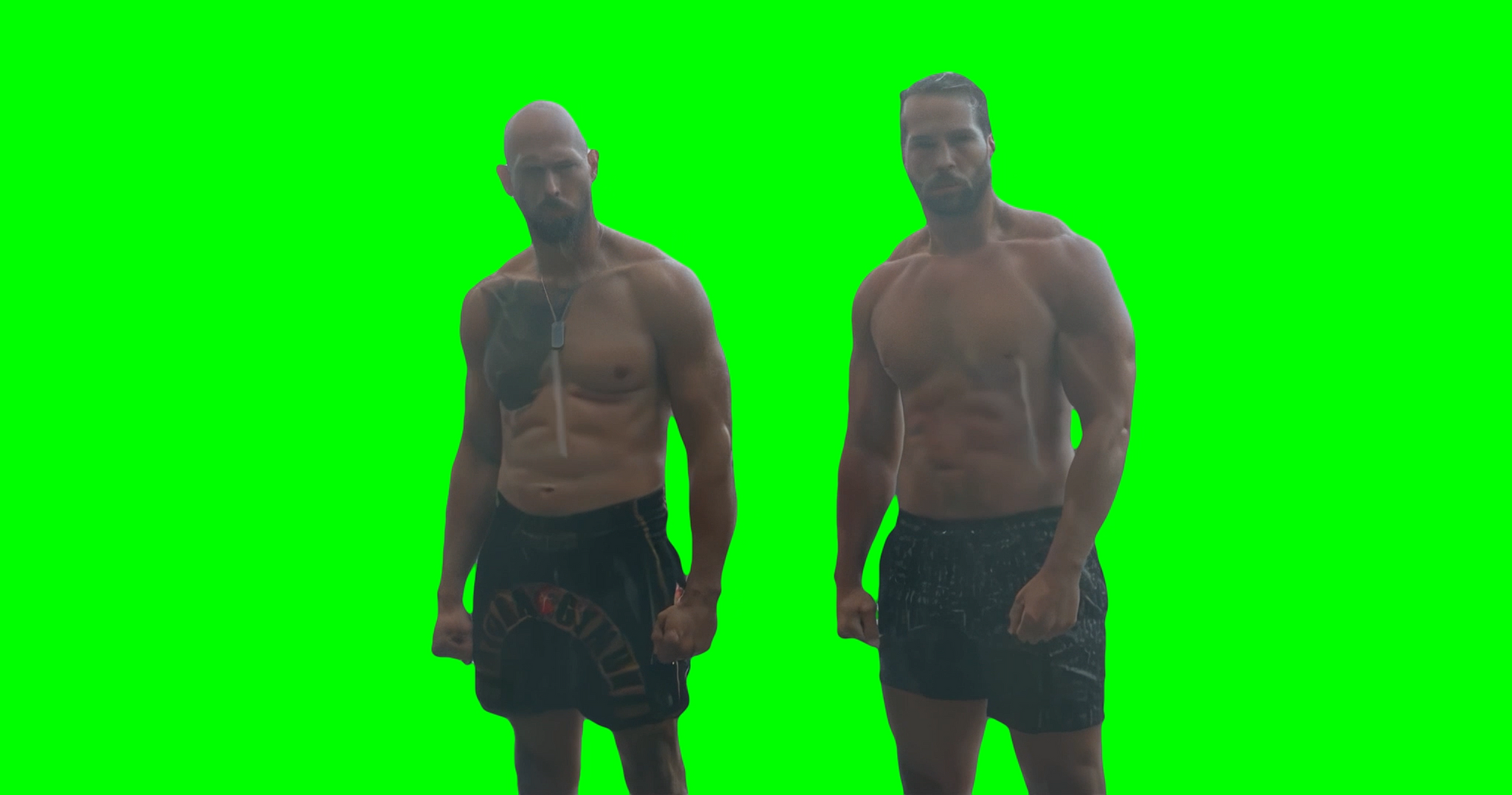 Green Screen Meme Template of Andrew Tate and Tristan Tate standing out in the rain while trying to look tough and strong
