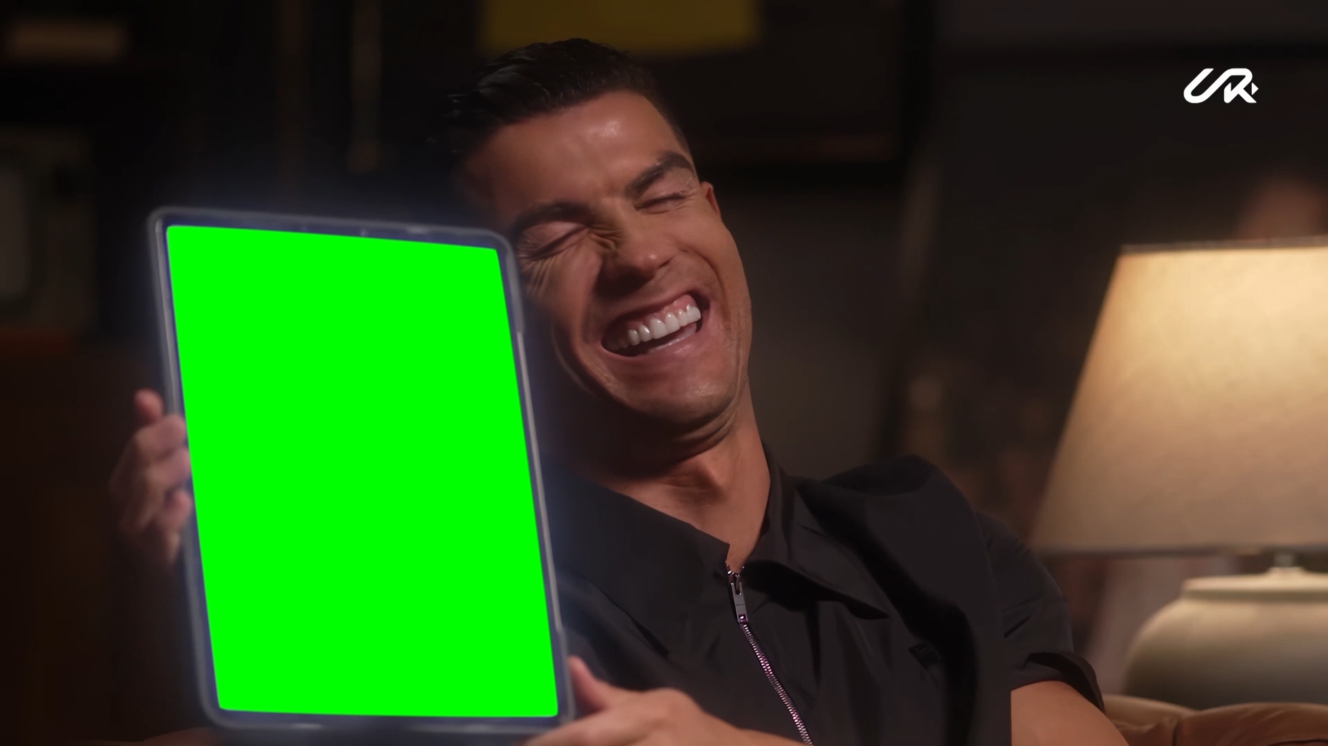 Green Screen Meme Template of Cristiano Ronaldo looking at his iPad screen then laughing