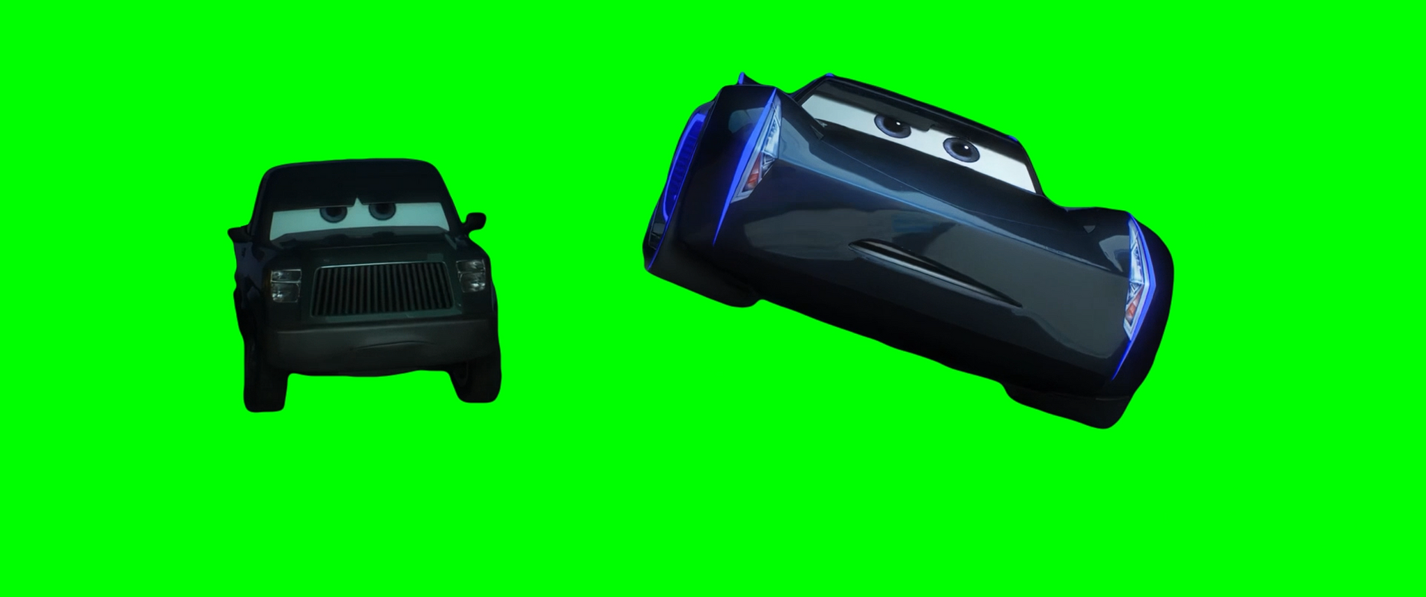 Green Screen Meme Template of Jackson Storm training in a Piston Cup Racing simulator when he asks "Who is that?" and Ray Reverham says "I put McQueen in there, to give you some real competition" and they both start laughing