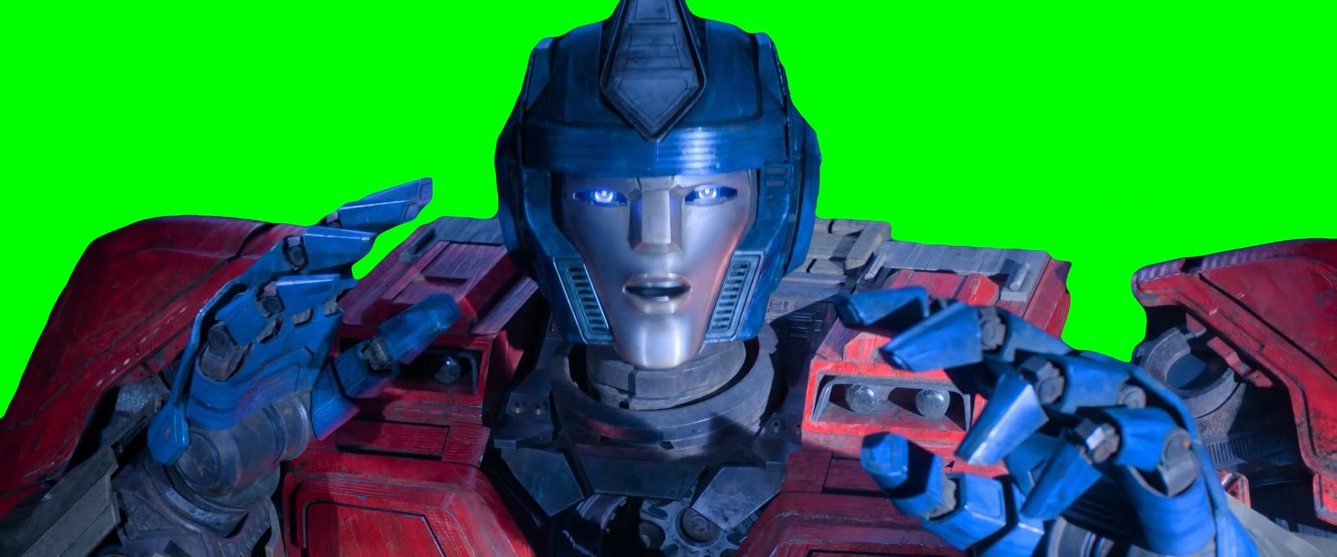 Green Screen Meme Template of Optimus Prime fake transforming then running away in the Transformers One movie