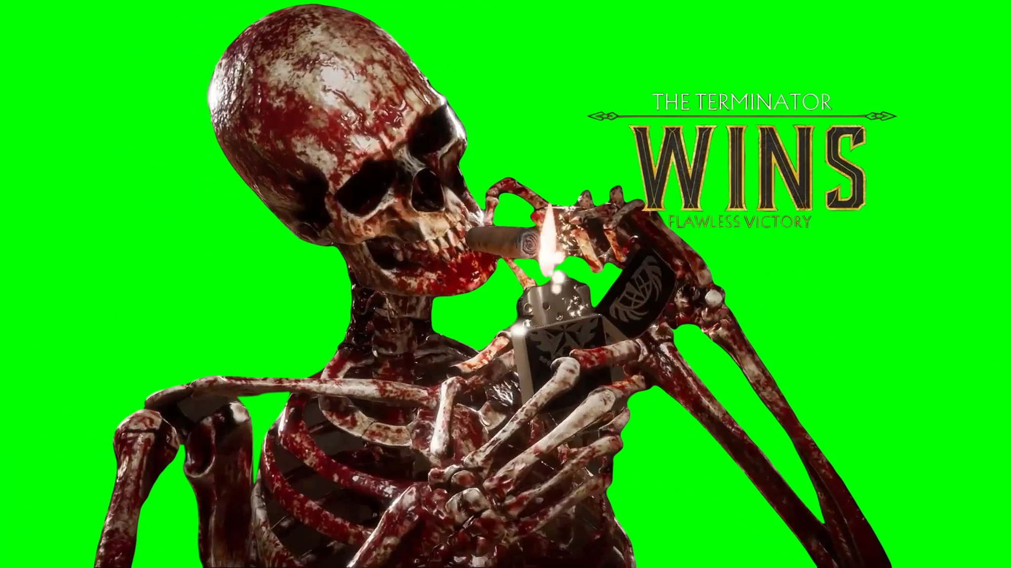 Green Screen Meme Template of a modded skeleton model of the Terminator from Mortal Kombat 11, used by @deathmule on YouTube, smoking a cigar after winning the fight