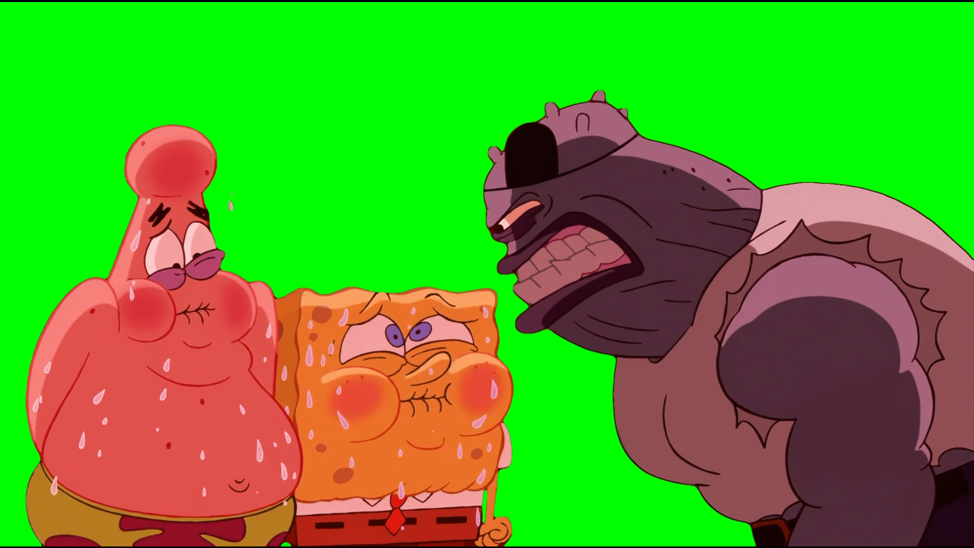 Green Screen Meme Template of SpongeBob and Patrick trying not to sing the Goofy Goober song in front of the Sailor fish