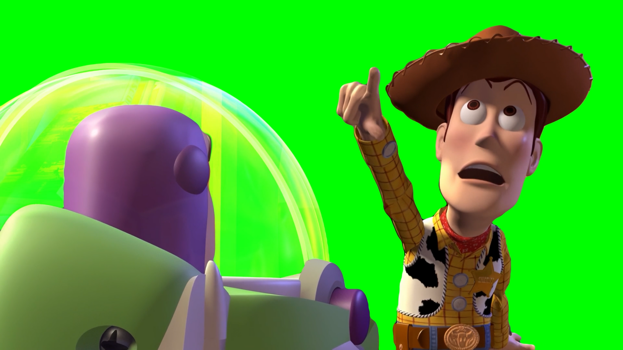 Green Screen Meme Template of Woody from the first Toy Story movie saying "BUZZ LOOK! AN ALIEN!" and then laughing at him