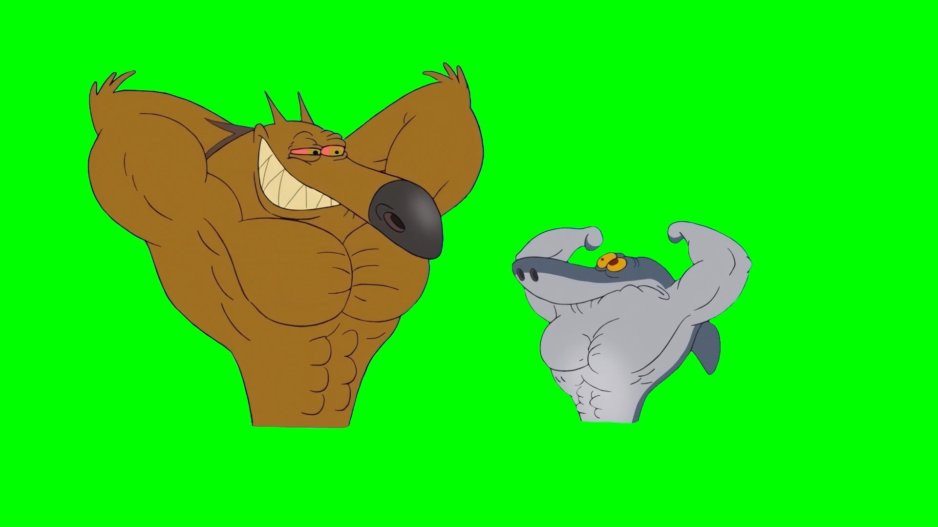 Green Screen Meme Template of Zig and Sharko are flexing their muscles in a competition.