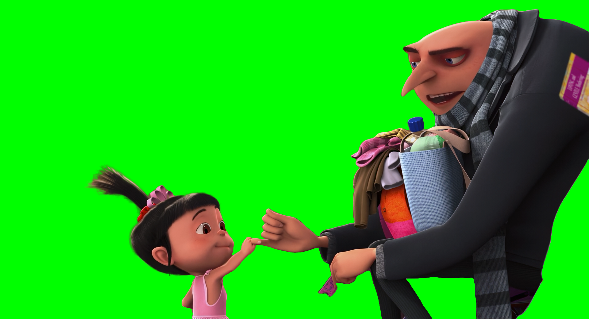 Green Screen Meme Template of Gru's daughter, Anges, asking Gru for a pinky promise. Gru sighs and pinky promises in a sarcastic tone, to which Agnes starts doing a ballerina dance
