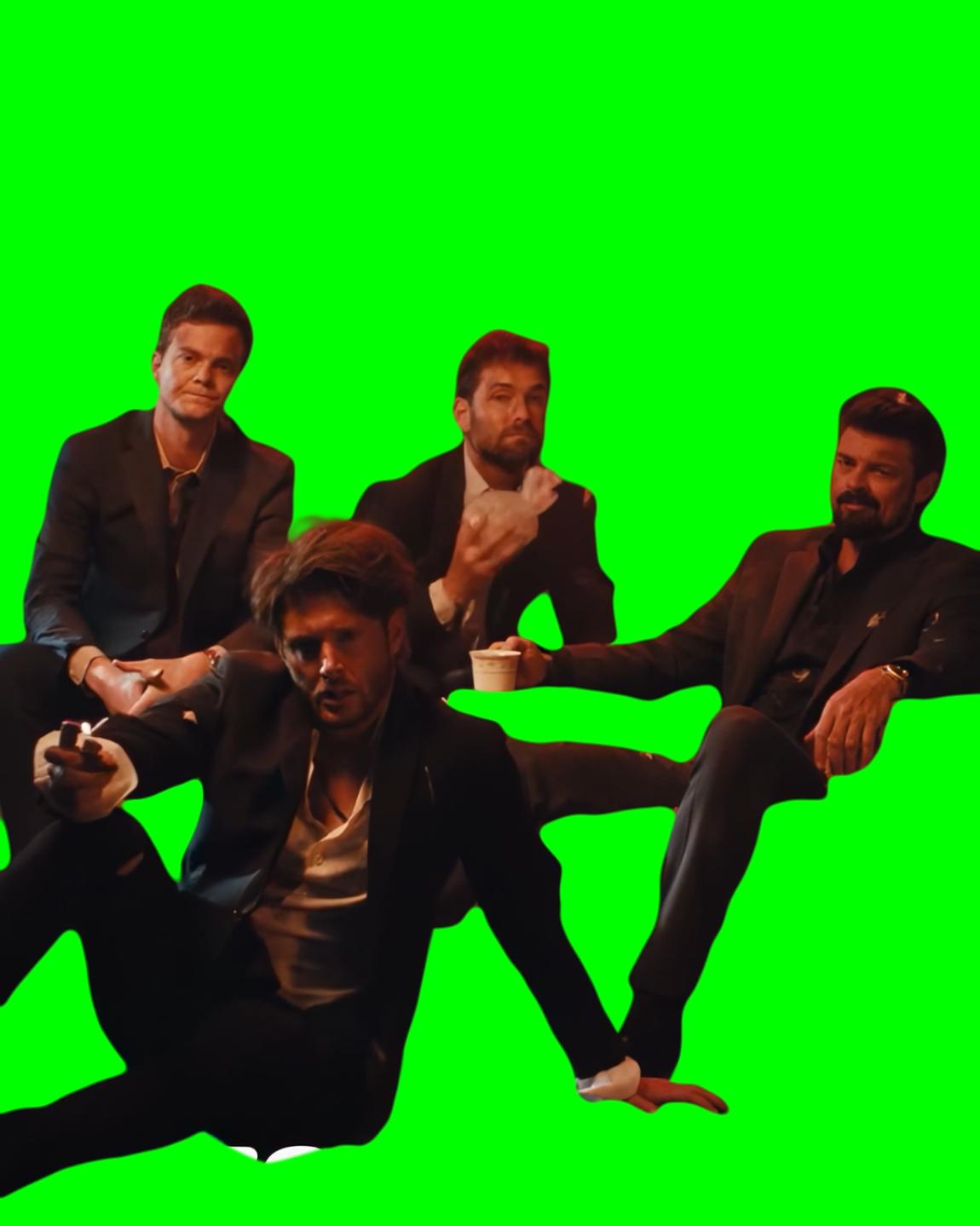 Green Screen Meme Template of Jensen Ackles waking up in a torn suit with the rest of the male cast of the Boys for the Entertainment Weekly Magazine cover photo