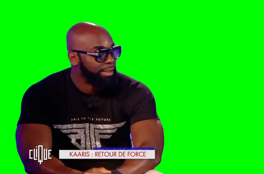 A green screen of a Rapper (Kaaris) saying : "J'm'en bats les c*uilles frère"