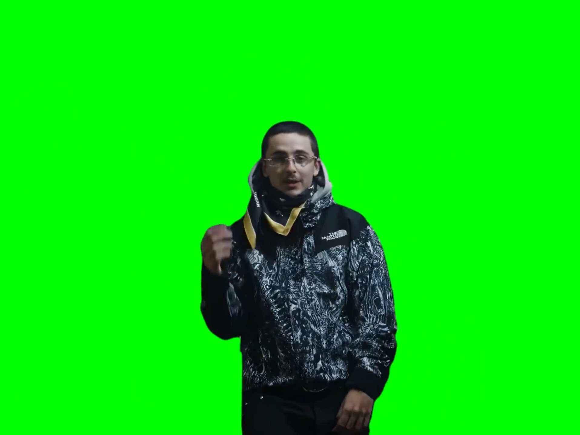 Green Screen Meme Template of Timothee Chalamet revealing himself to not be British Rapper EsDeeKid in the music video of the remix of his song 4 Raws