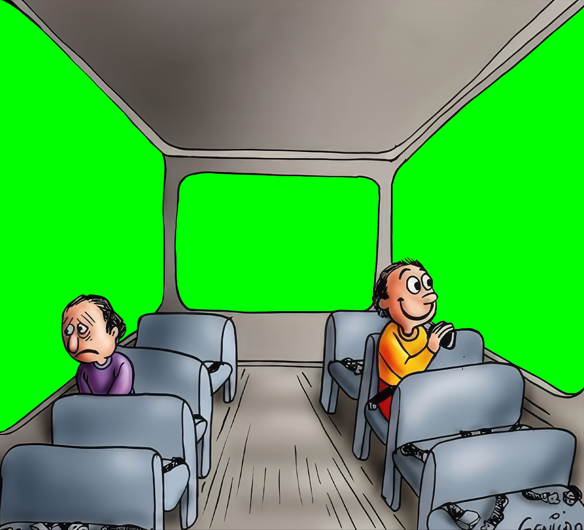 Green Screen Meme Template of 2 guys looking outside the bus window where the right side is happy and the left side is sad