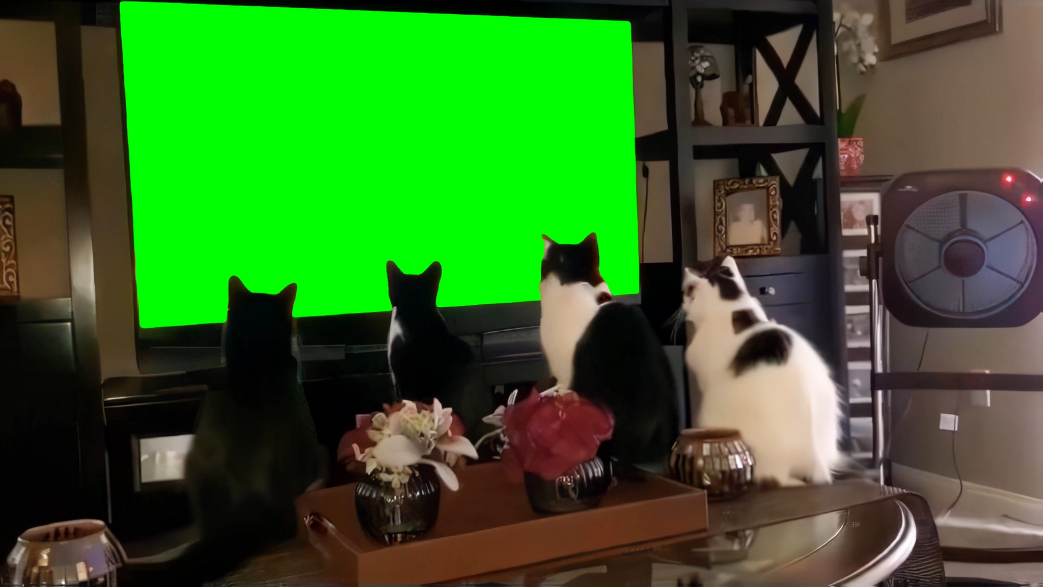 Green Screen Meme Template of 4 cats looking at a TV screenSource: https://youtu.be/i56xvYyDT6w?si=py_Eyf7h6sHw3BVl