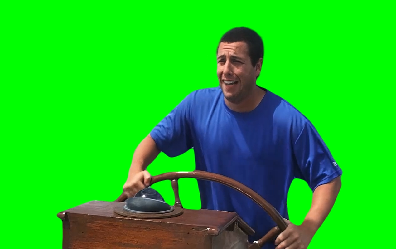Green Screen Meme Template of Adam Sandler singing "Wouldn't It Be Nice" by The Beach Boys while driving a boat in the sea