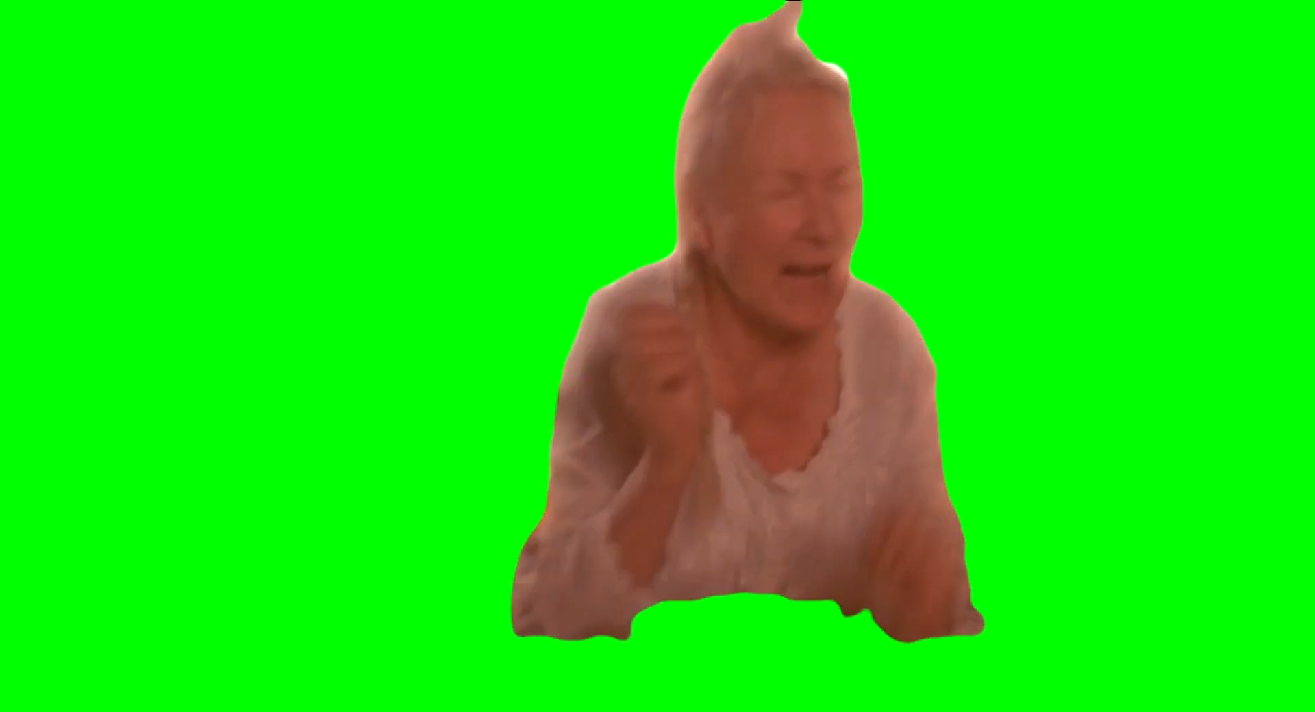 Green Screen Meme Template of Aunt May praying before Green Goblin blows up Aunt May's room Aunt May: "Lead us not into temptation, but deliver us-"