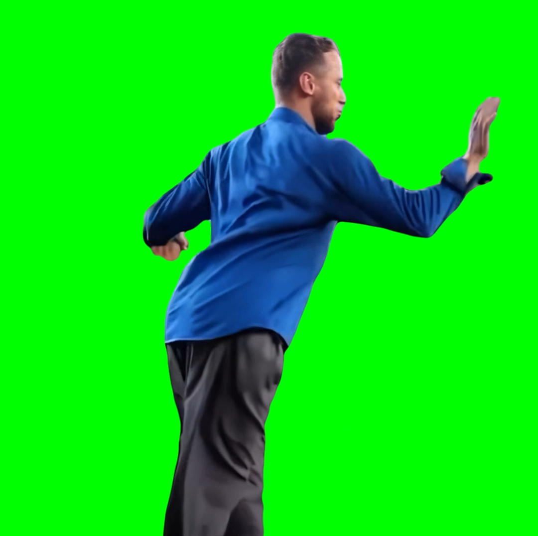 Green Screen Meme Template of Blue Shirt Guy (@aidaev_ruslan on Instagram) doing a dance move called "whisk" to the slowed version of the song Assumptions by Sam Gellaitry