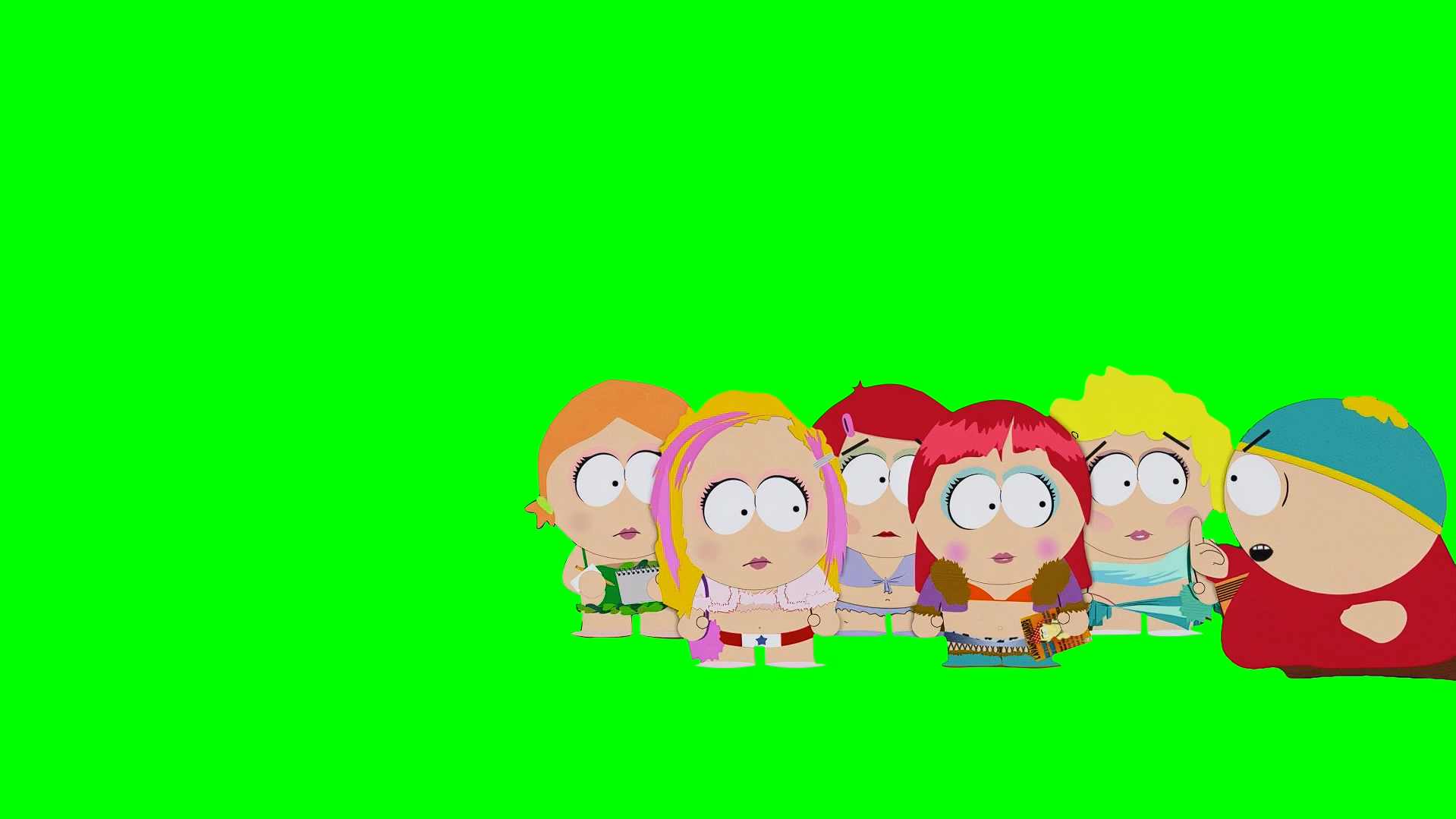 Green Screen Meme Template of Eric Cartman walking in front of a group of girls, hoping to be invited to their party but then he gets mad and goes to them saying "Fuck you, Millie! Fuck you, Annie! Fuck you, baby! Fuck you, whatever your name is, and fuck you, bitch!"