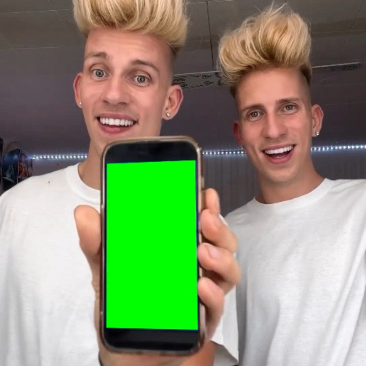 A Green Screen of the Voros Twins aka DaVinki/Davinky twins showing you something on their phone with the Among Us imposter sound effect