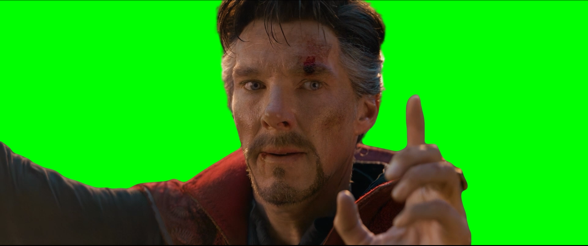 Green Screen Meme Template of Doctor Strange looking at Tony Stark and raising his index finger as a signal to win the final battle of Avengers: Endgame