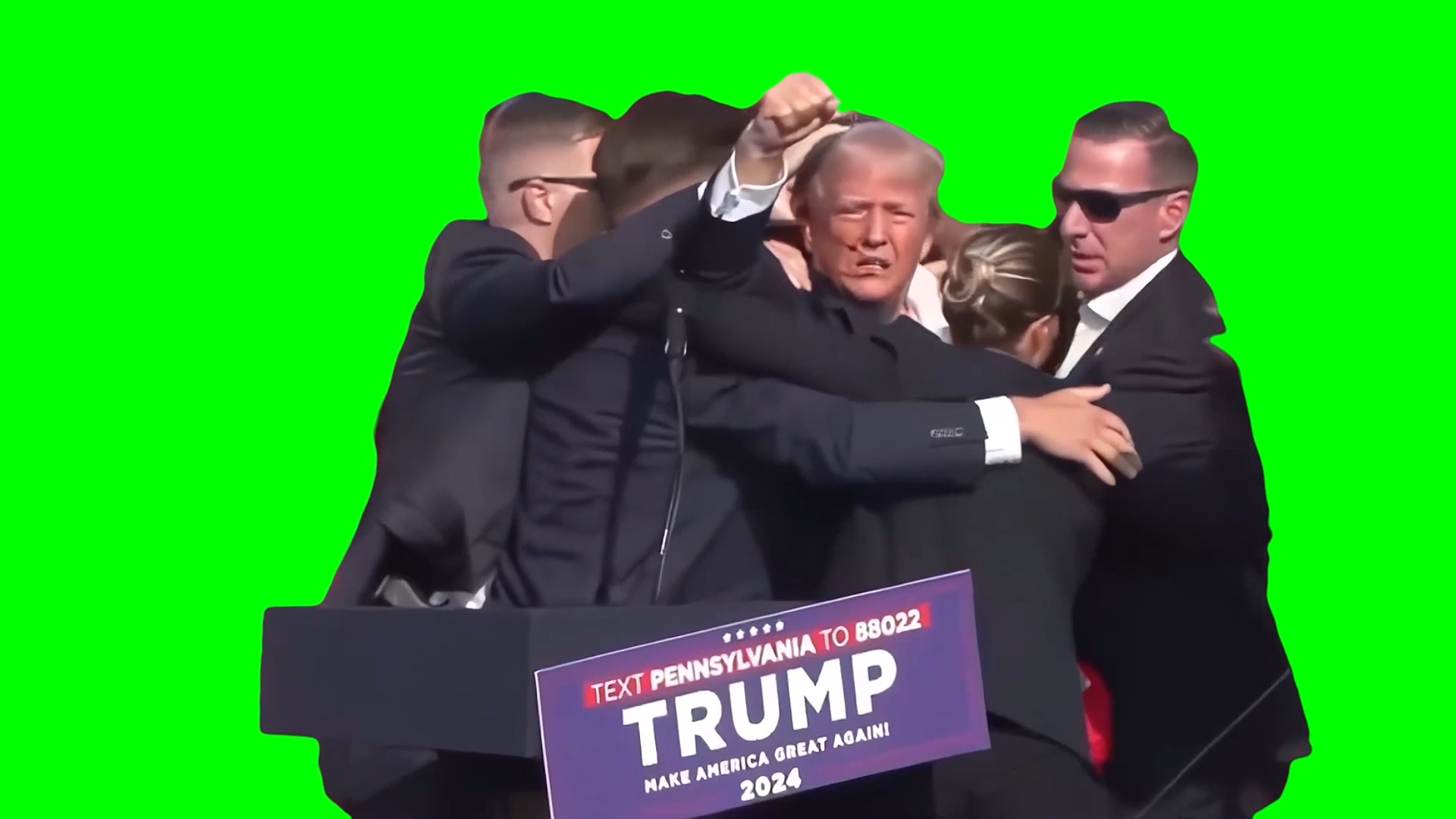 Green Screen Meme Template of Donald Trump raising his fist and surrounded by bodyguards after his failed assassination attempt in Butler, Pennsylvania