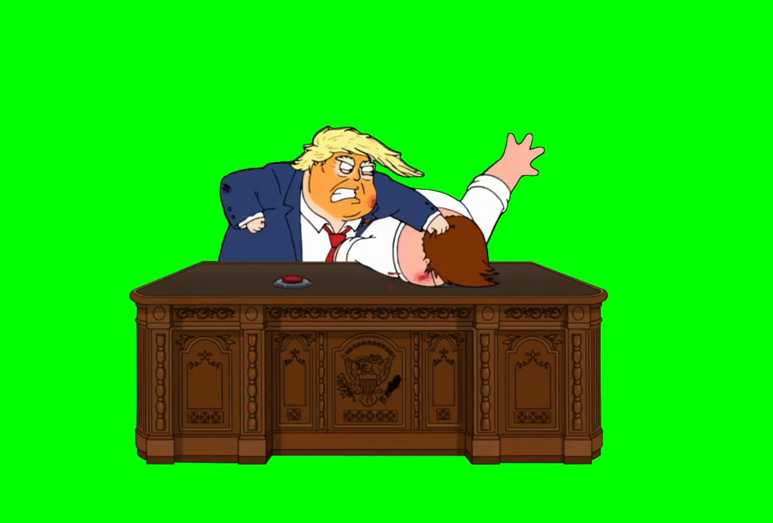 Green Screen Meme Template of Donald Trump holding Peter Griffin's head, and pressing the red buttons on the President's Table by hitting Peter's head against them