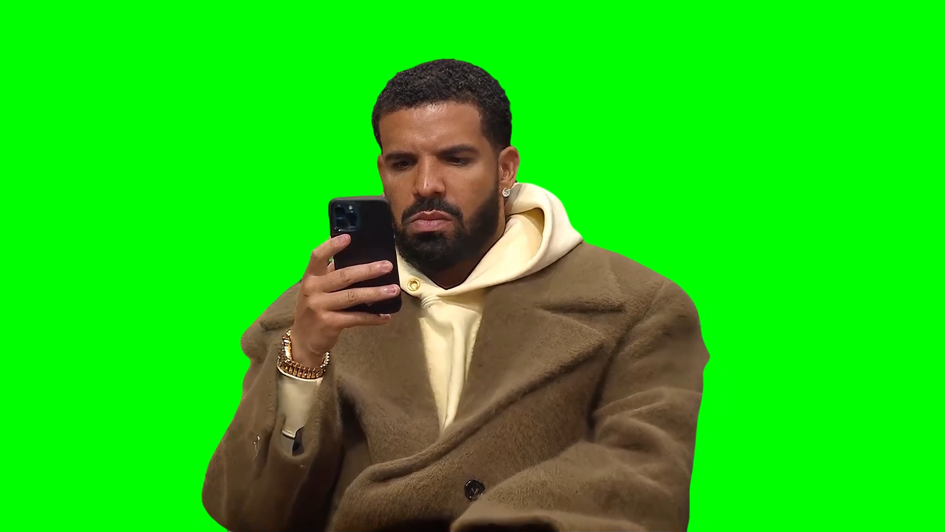 Green Screen Meme Template of Drake looking bothered at his phoneSource: https://twitter.com/BleacherReport/status/1488694654623121413