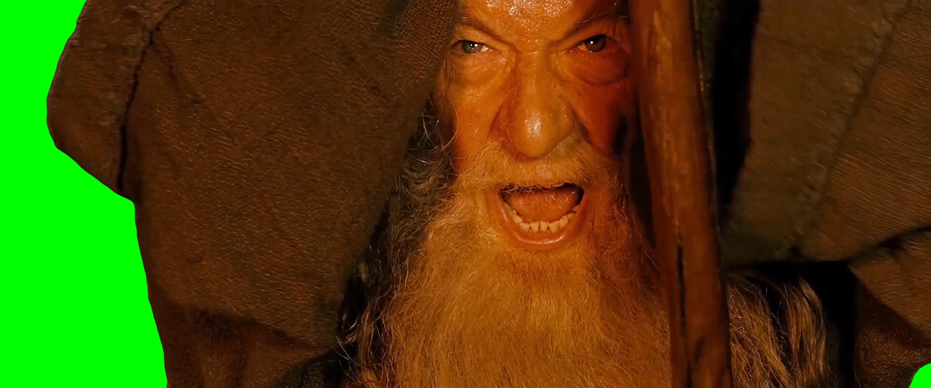Green Screen Meme Template of Gandalf saying "YOU SHALL NOT PASS!" and tapping his staff on the ground
