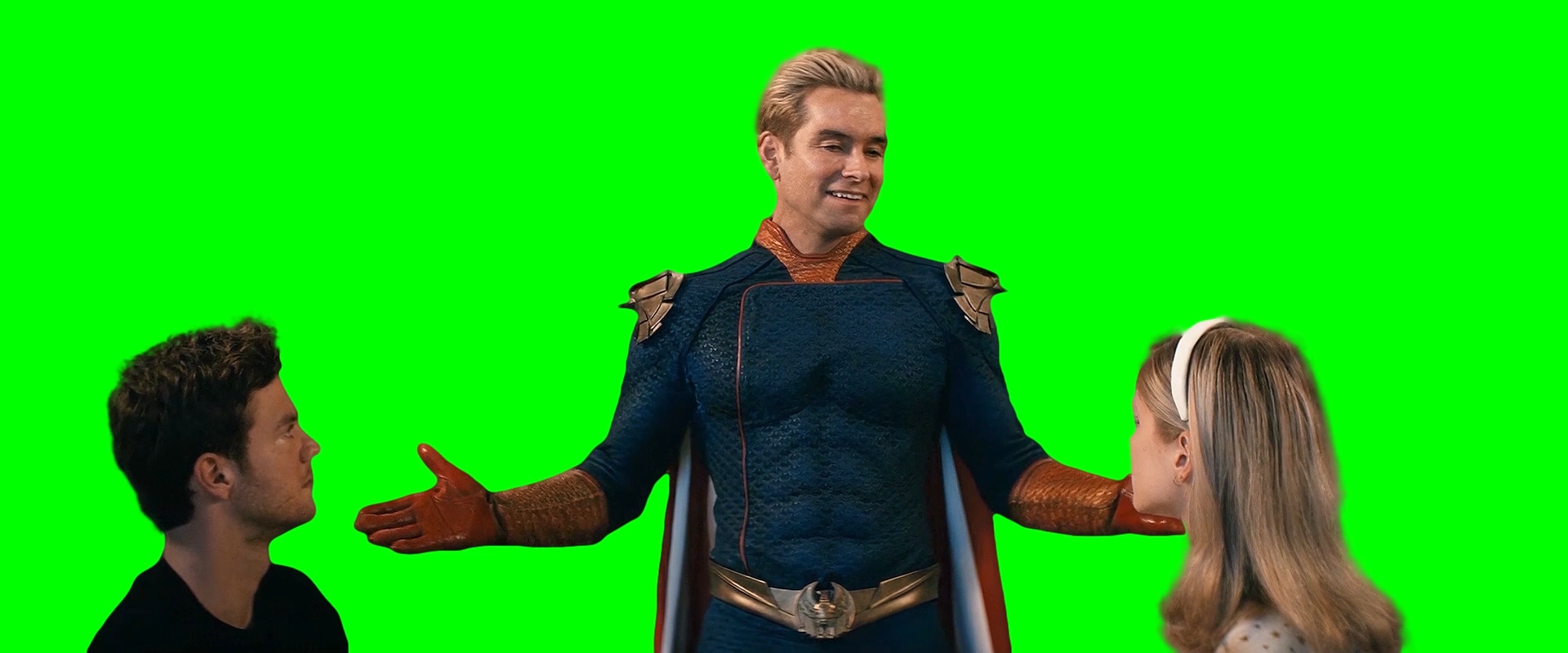 Green Screen Meme Template of Homelander saying "I'm kidding! Come on, lighten up. I'm joking!" to Hughie and Starlight in The Boys TV show