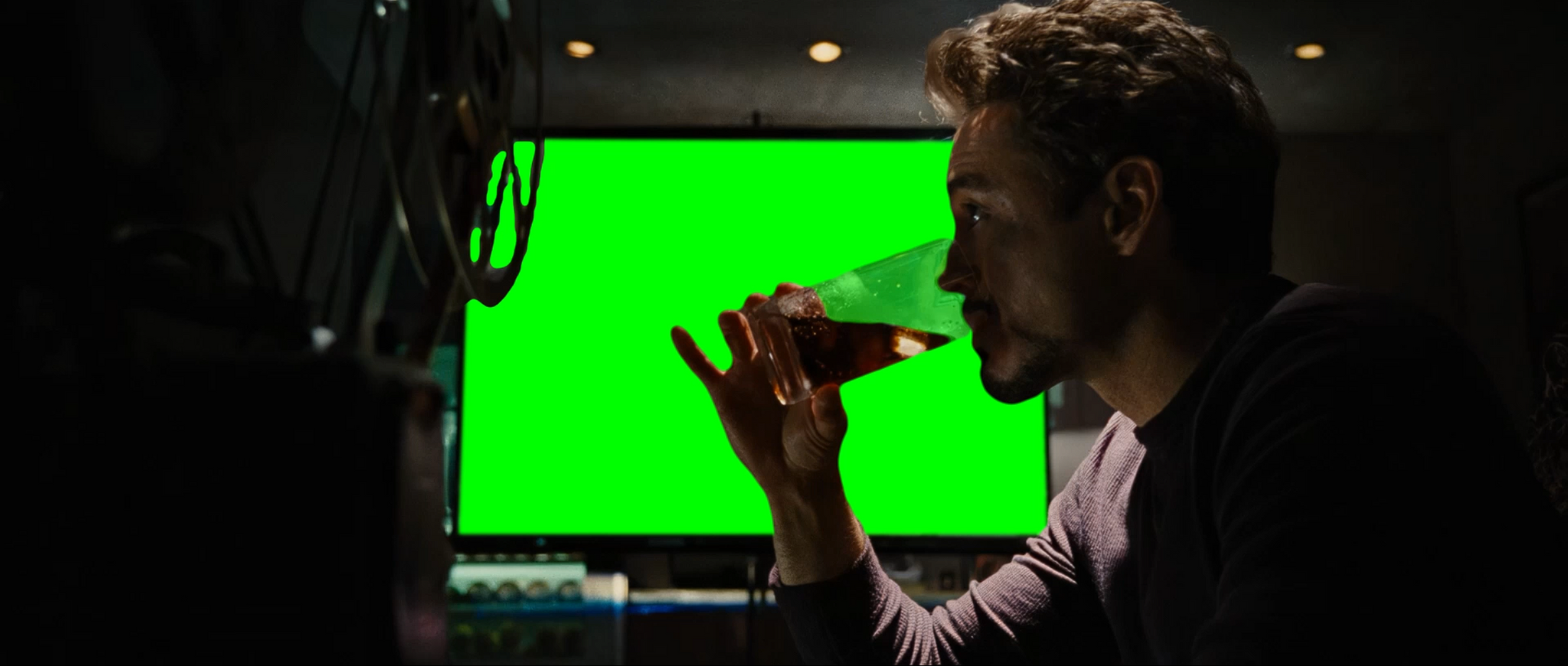 Green Screen Meme Template of Tony Stark looking at the projector where his father, Howard Stark, where he made a video for Tony for when he grows up to watch it
