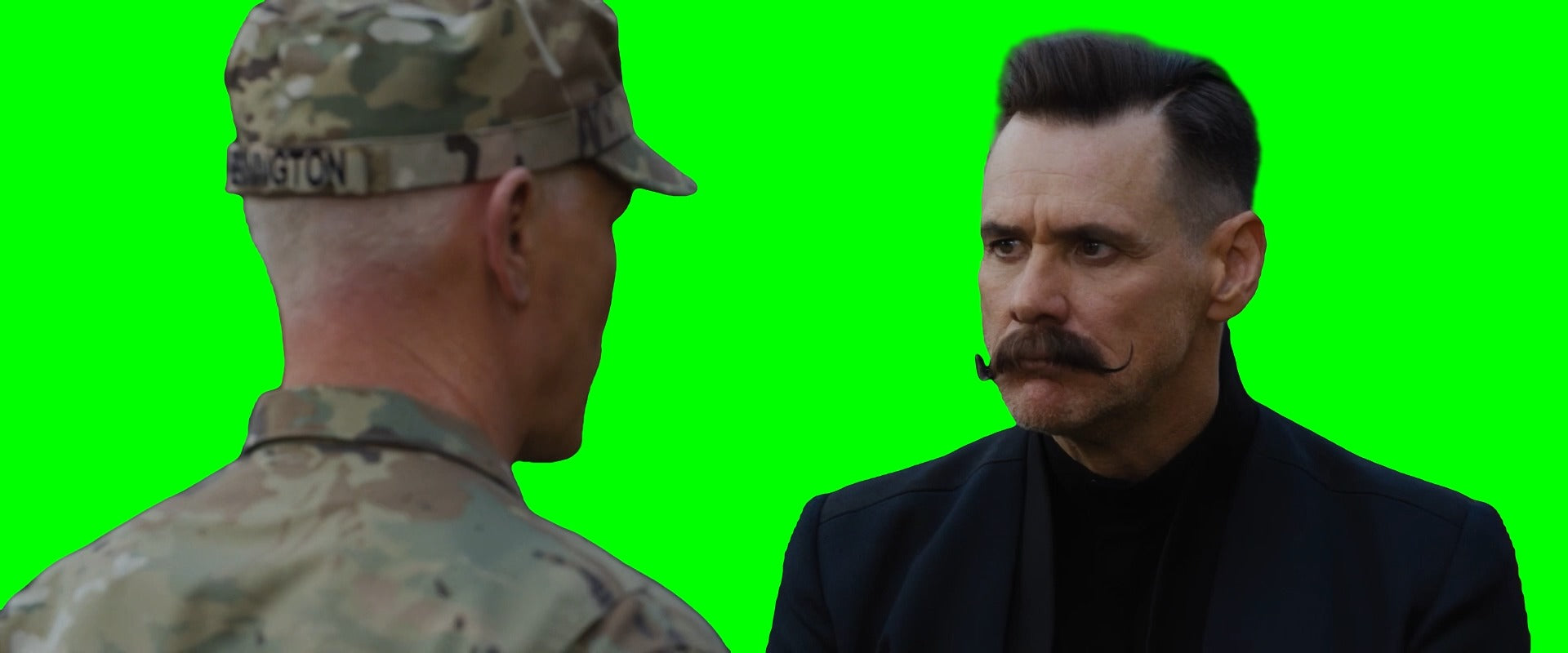 Green Screen Meme Template of Jim Carrey saying "Are you in charge?" to the commander and interrupting him when the commander tries to answer