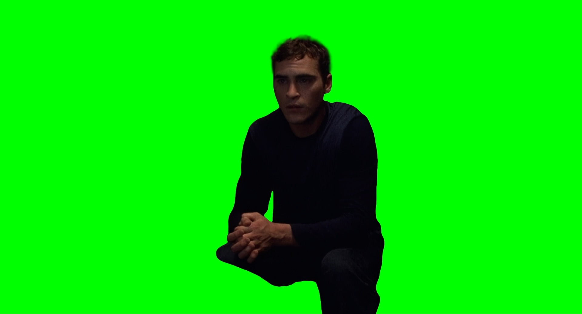 Green Screen Meme Template of Joaquin Phoenix getting scared of what he sees in the TV