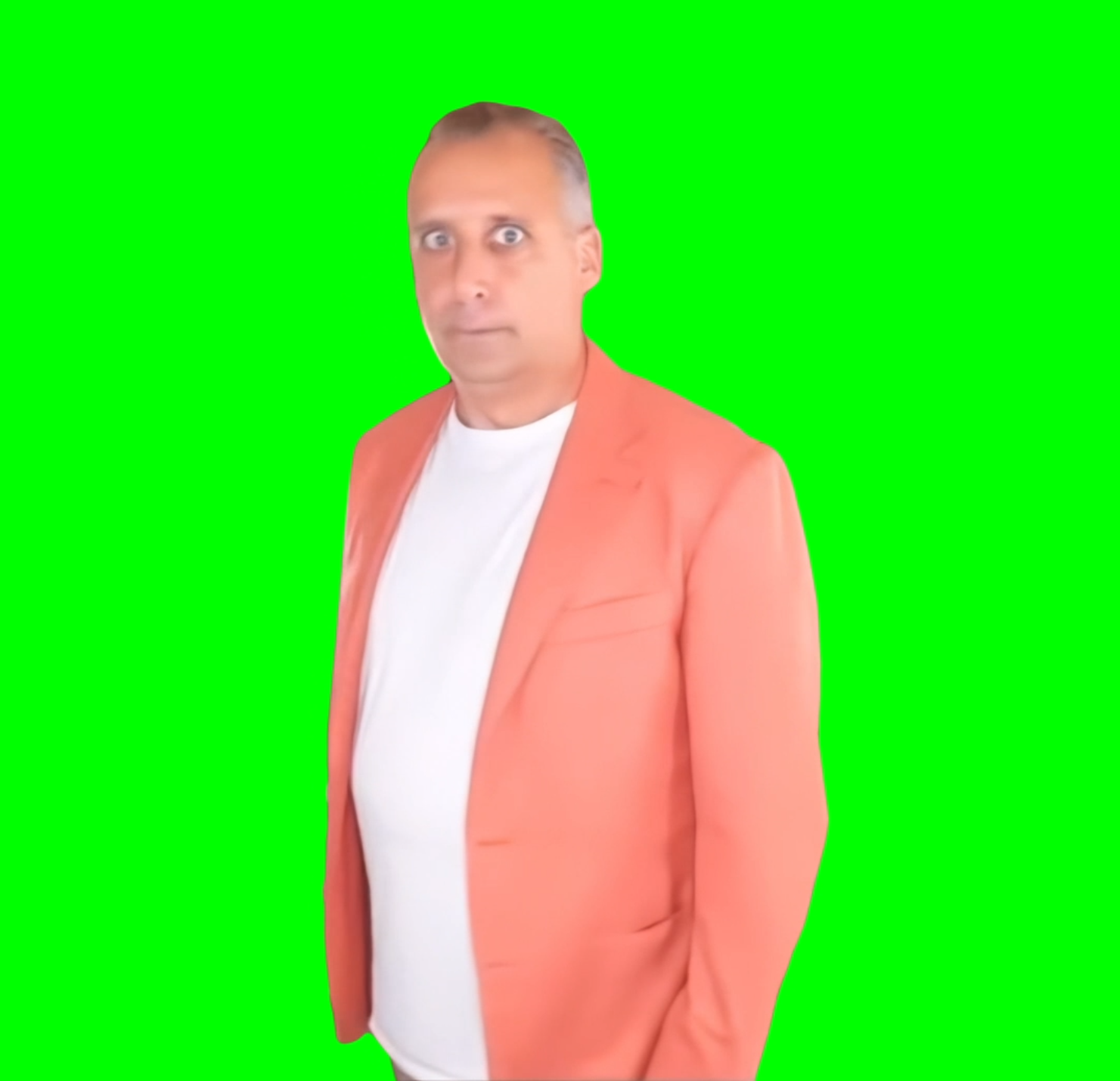 Green Screen Meme Template of Joe Gatto staring at the camera as it is while spinning and changing his reaction from smiling to serious.