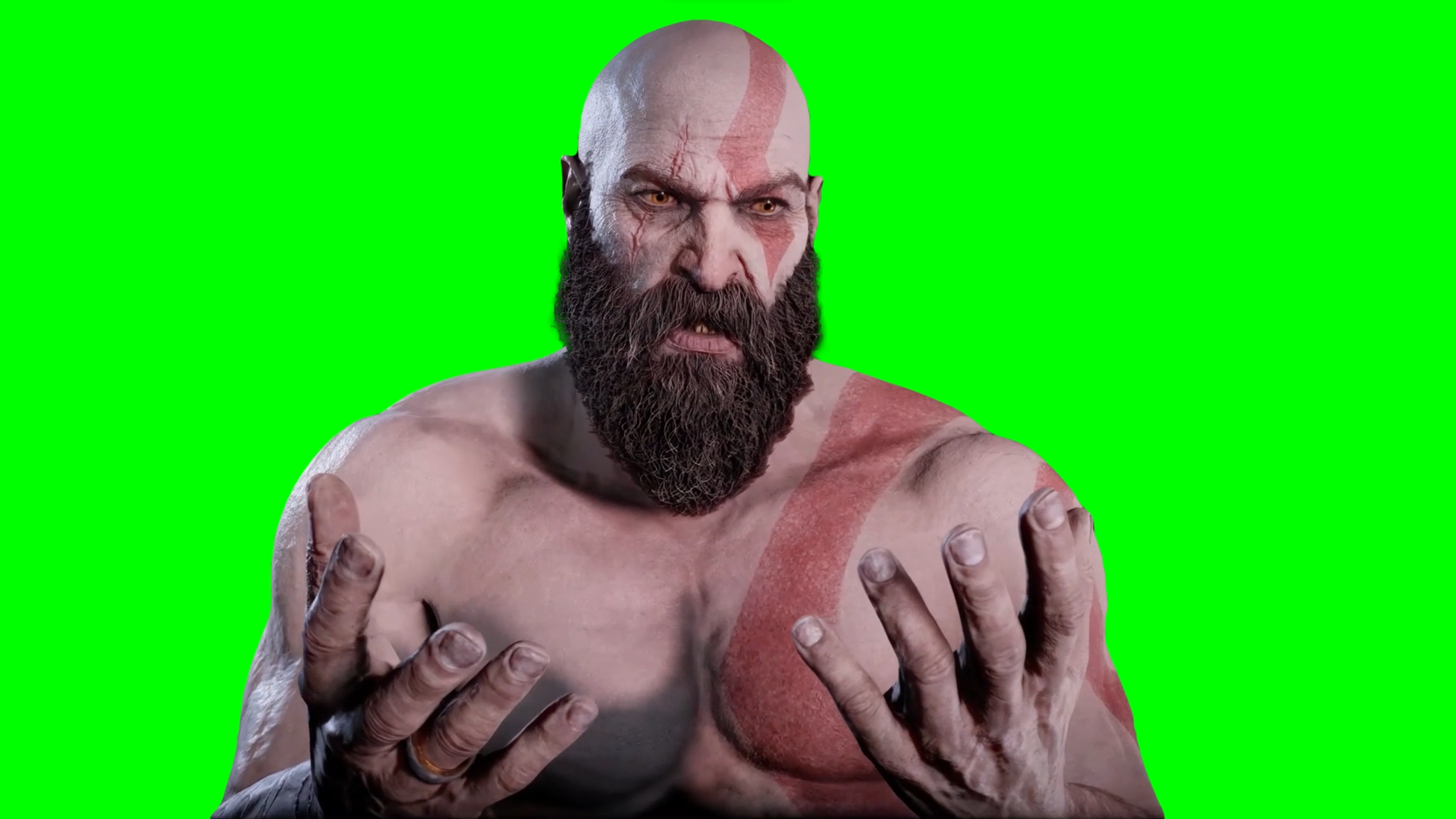 Green Screen Meme Template of Kratos looking at his hands and shivering in shock after dreaming about his wife Faye in the God of War Ragnarok (2022) videogame