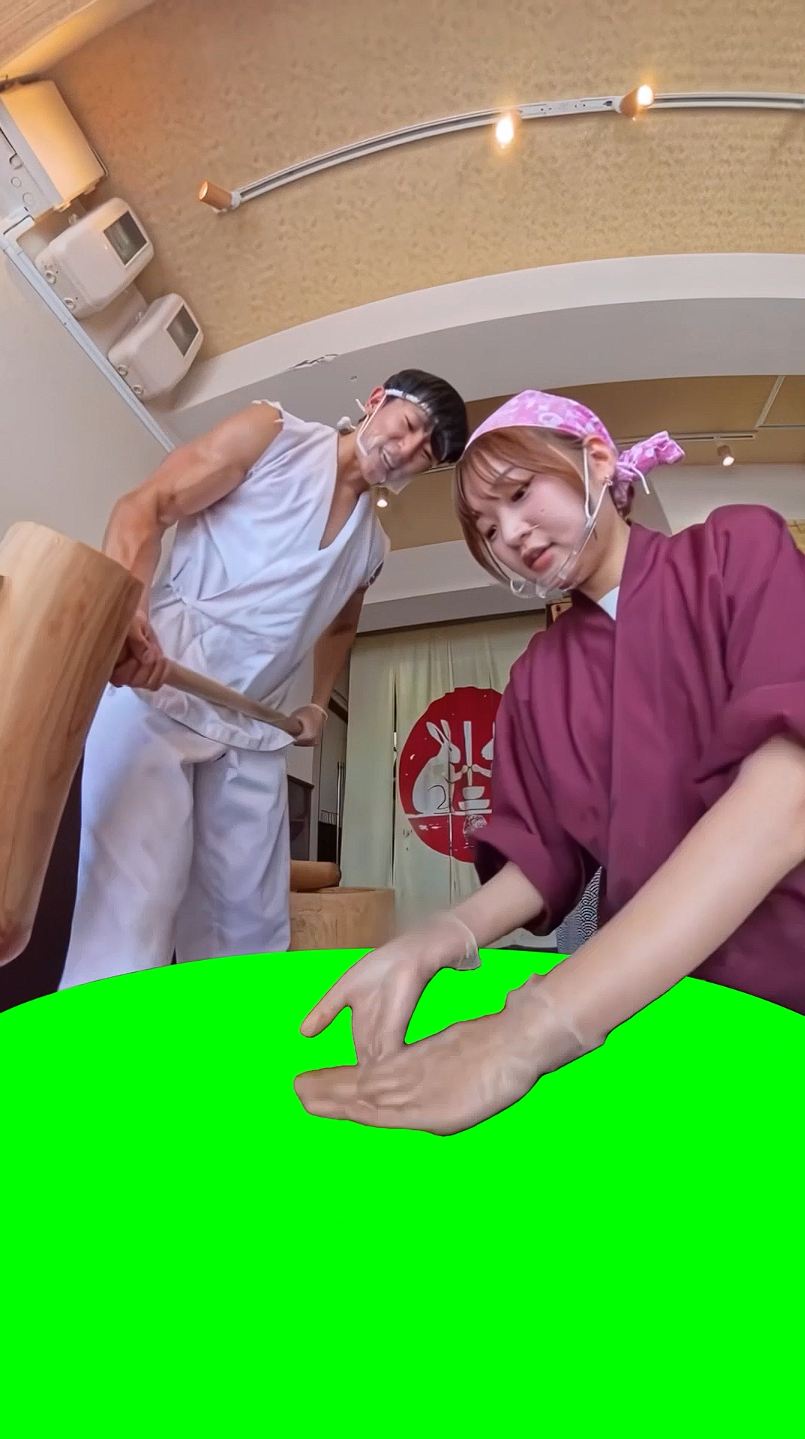 Green Screen Meme Template of a Japanese man (@mochimochi.kyoto on Instagram) pounding some mochi while saying "YUSHO HAI" while his assistant says "Yoi! Yoi!"