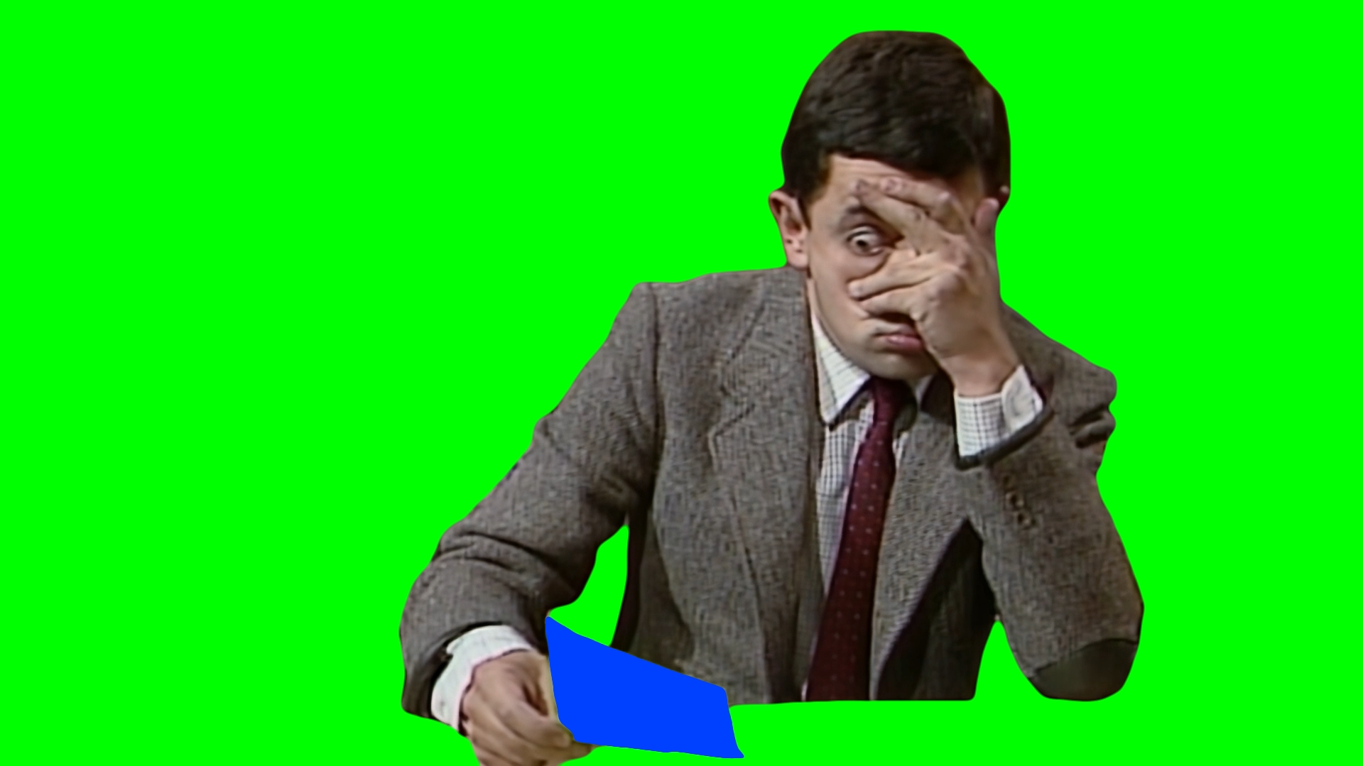 Green Screen Meme Template of Mr. Bean taking a look at his exam paper and stressing out and being scared