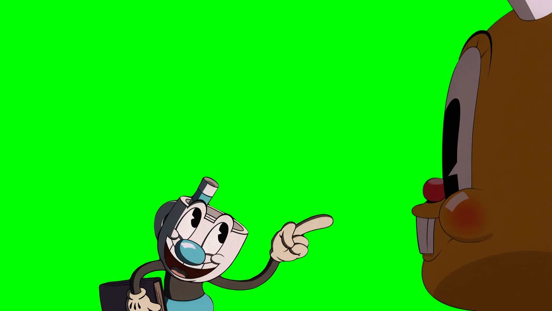 Green Screen Meme Template Mugman saying "THAT'S A GOOD ONE!" in The Cuphead Show