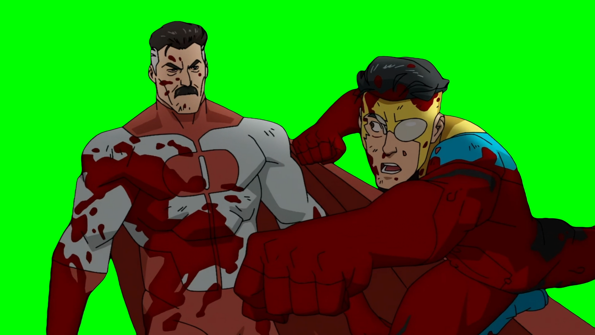 Green Screen Meme Template of Omni-Man dodging Mark's punch and hitting him from behind in the train station