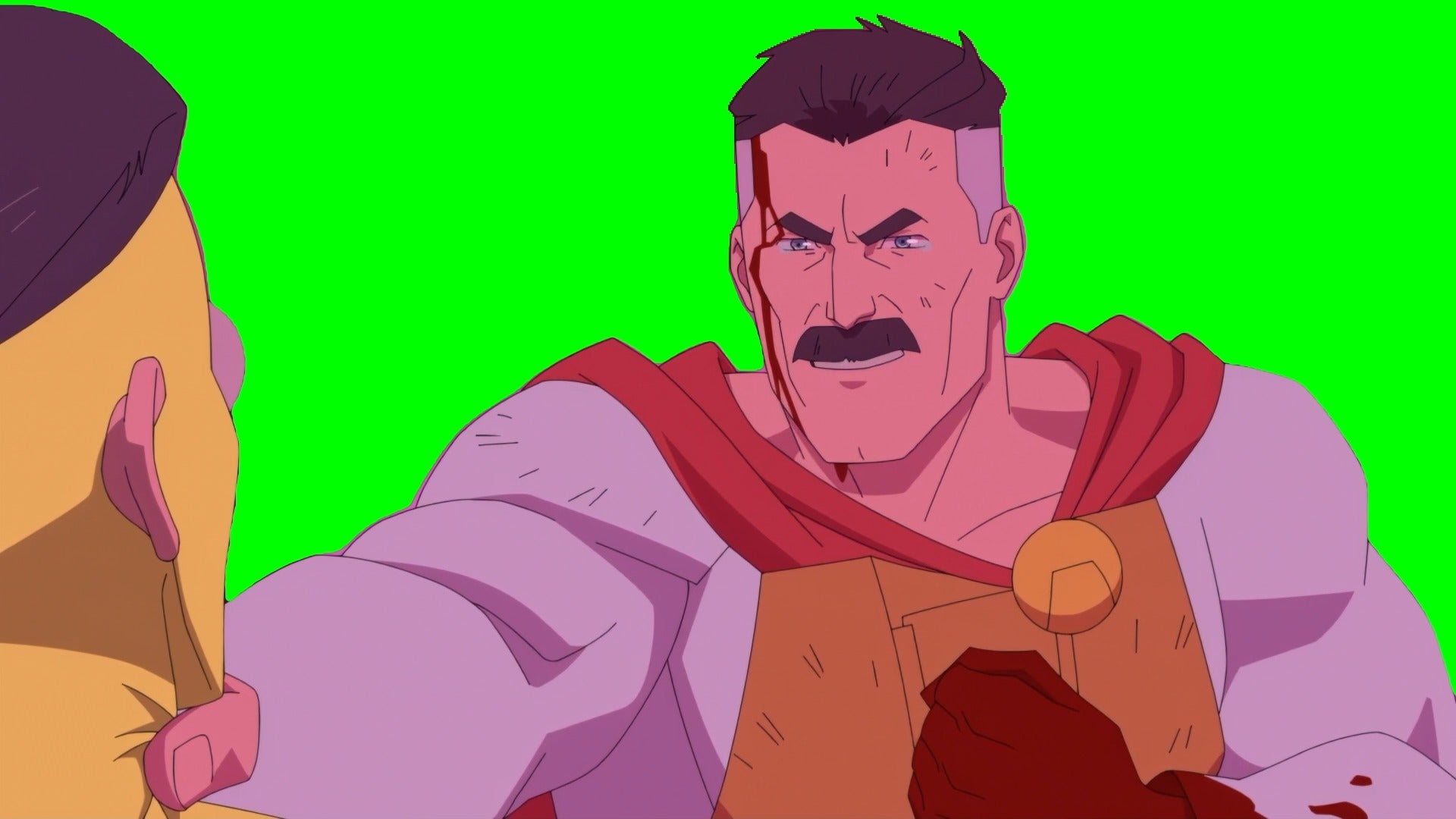 Green Screen Meme Template of Omni-Man saying "I am not supposed to feel this way." to Invincible while being sad