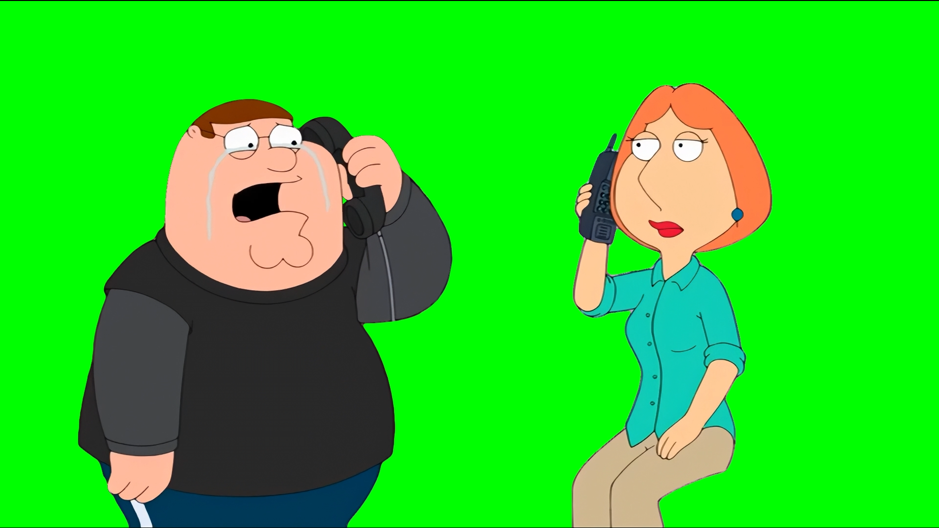 Green Screen Meme Template of Peter Griffin calling Lois and saying "I hate it here, I wanna come home. " and then Stewie calls and says "Is fatass home yet?"