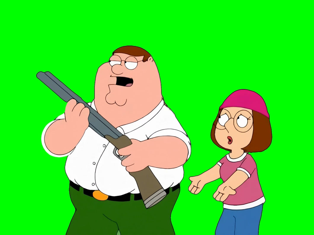 Green Screen Meme Template of Peter Griffin holding a gun and saying "I Just Wanna Talk To Him" to Meg in the Family Guy TV show