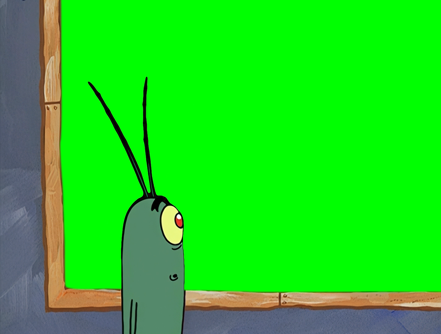 Green Screen Meme Template of Karen writing Plankton's real name on the screen to make fun of Plankton while everyone laughs at him.