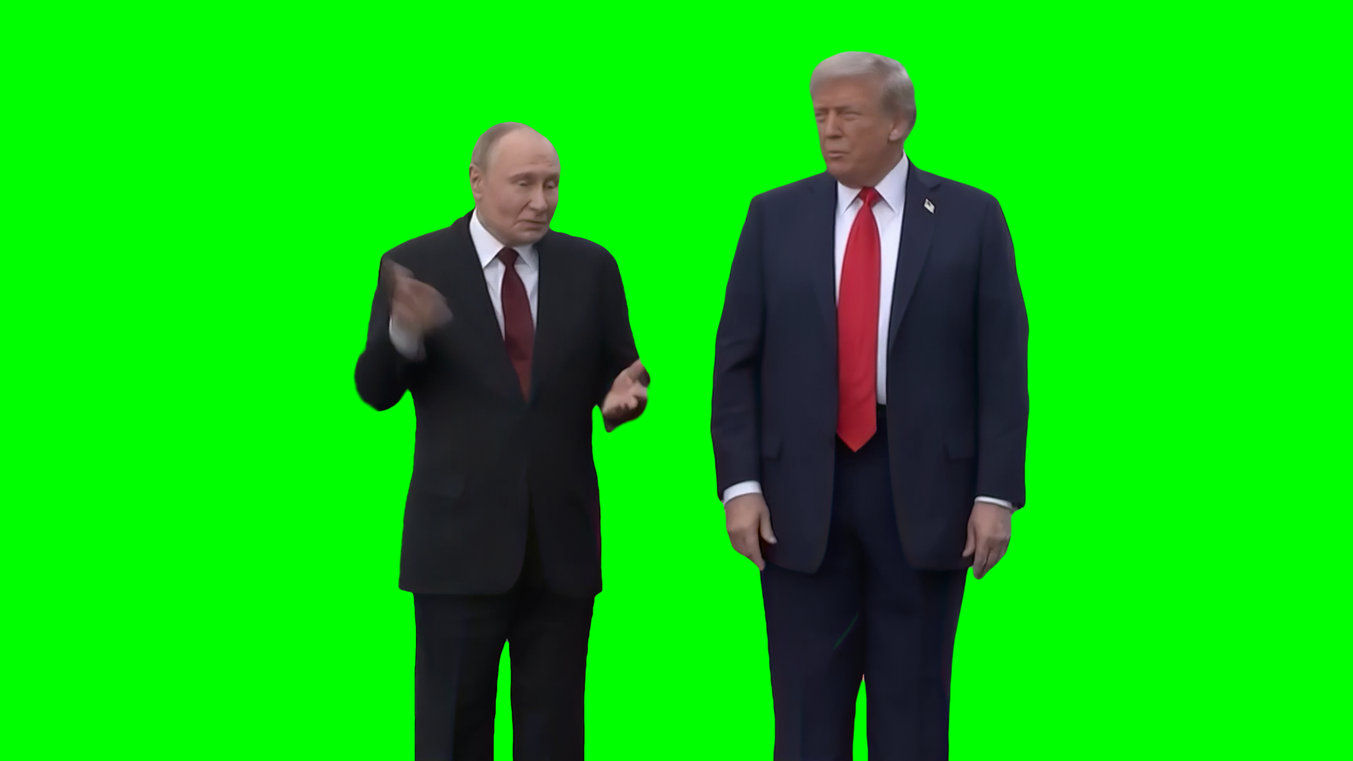 Green Screen Meme Template of President Vladimir Putin gesturing "I can't hear you" when a journalist asked "Will you stop killing Civilians?" while standing next to Donald Trump