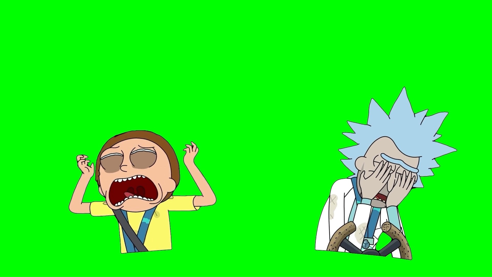 Green Screen Meme Template of Rick and Morty crying together inside a car/spaceship.