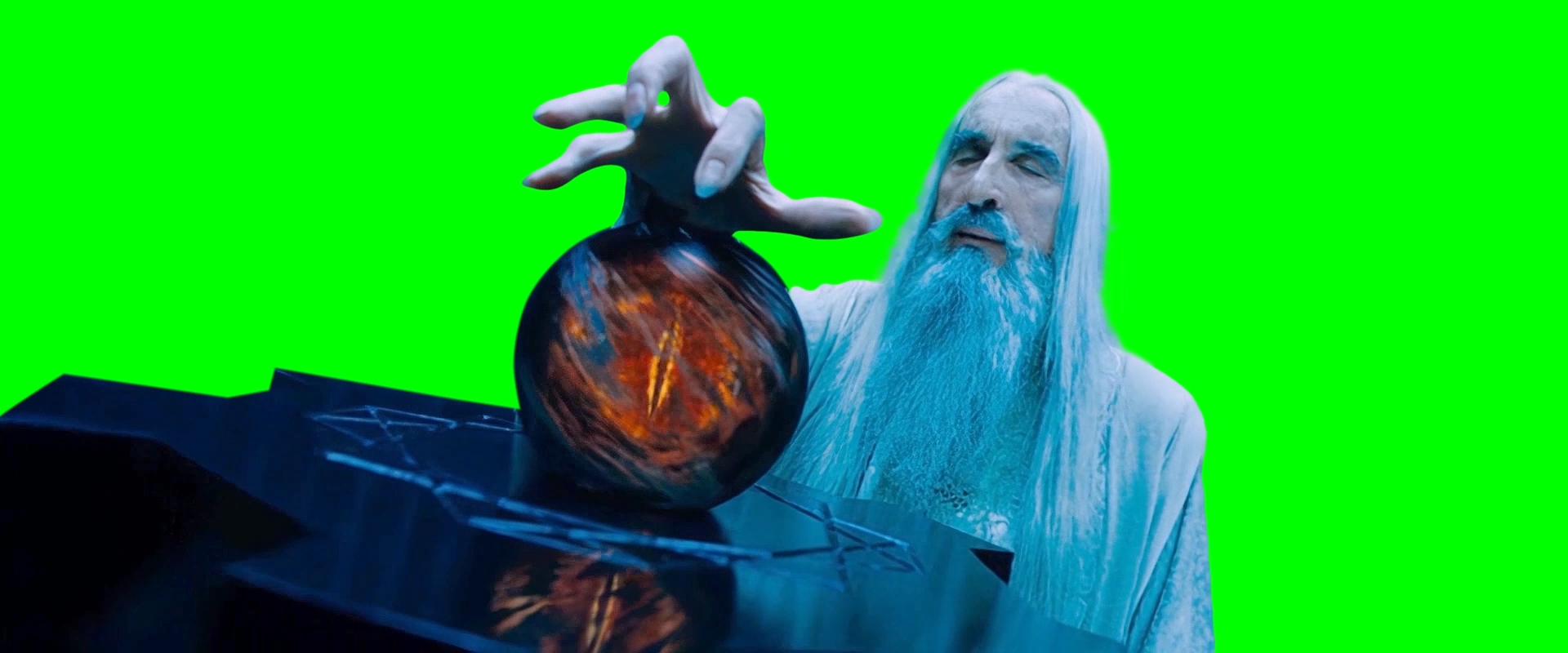 Green Screen Meme Template ofSaruman playing with the Sauron's Ball Palantir