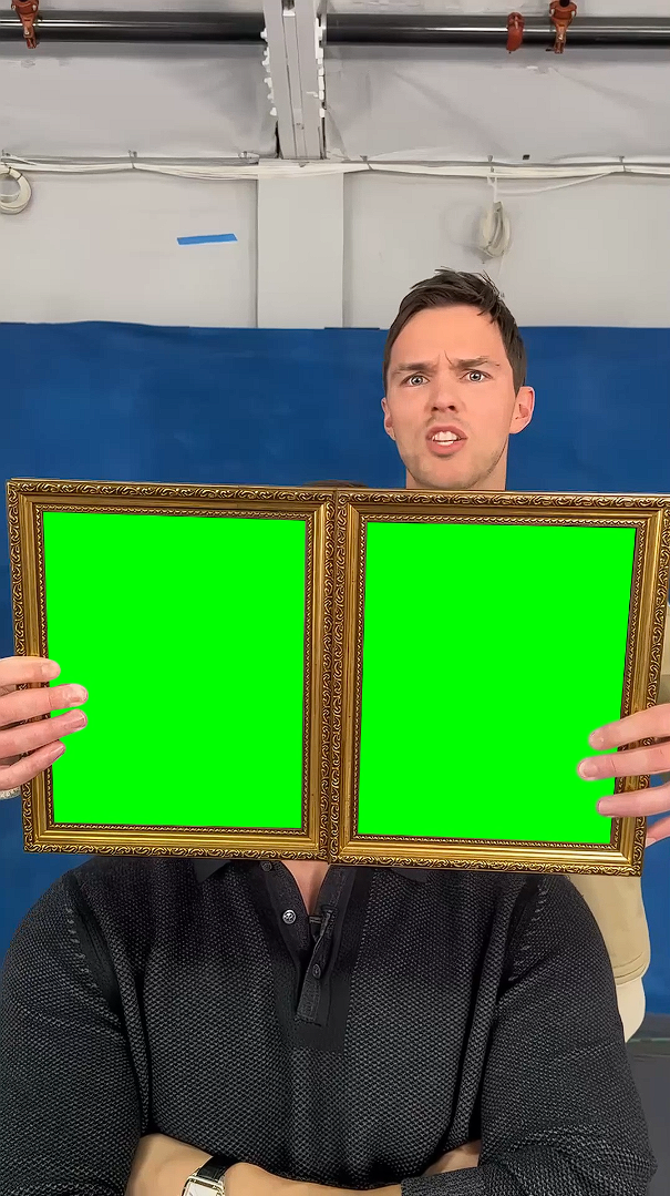 Green Screen Meme Template of Nicholas Hoult showing two framed photos of Clark Kent before showing David Corenswet face