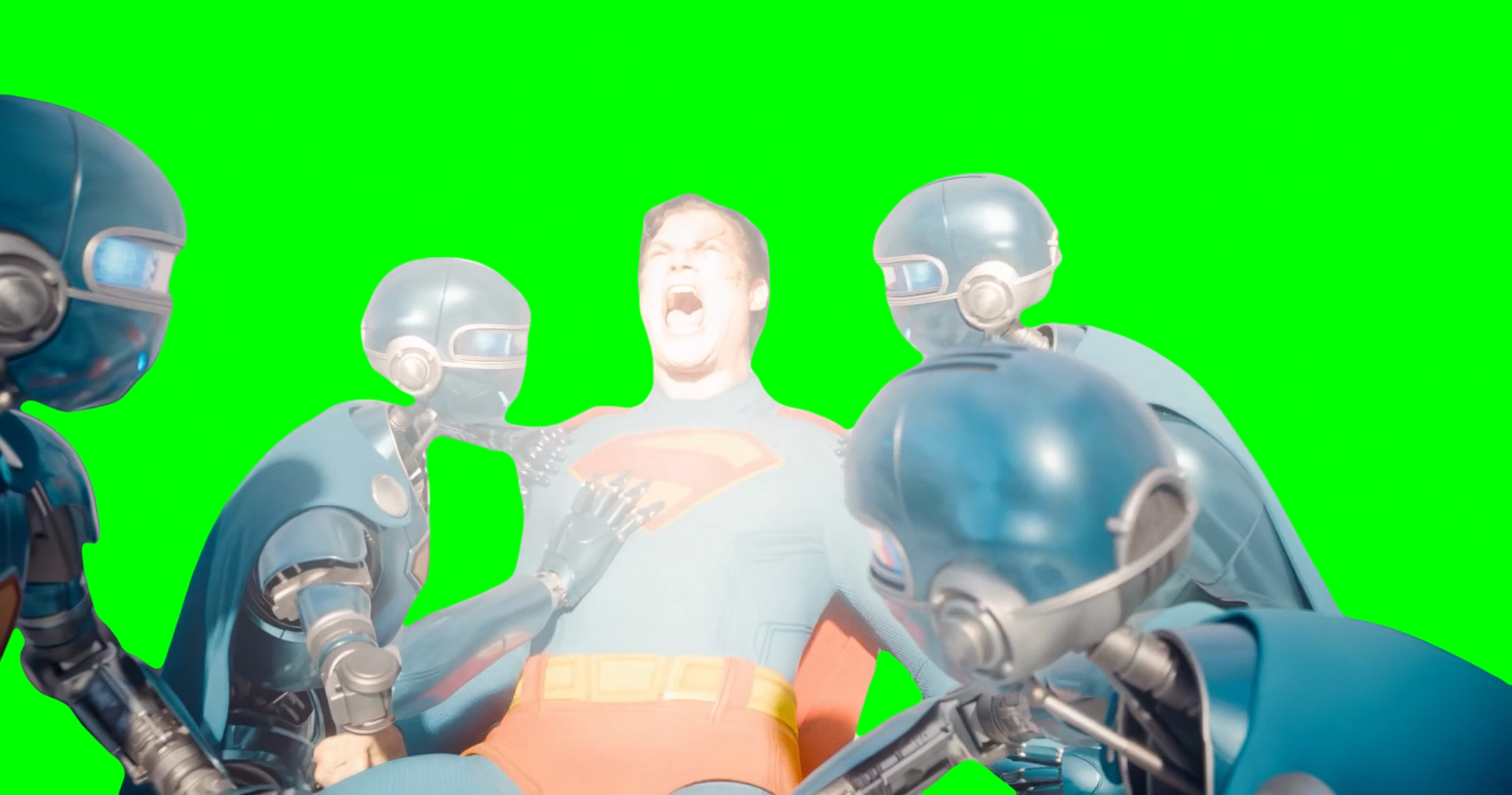 Green Screen Meme Template of Superman robots holding down Superman/Kal-El/Clark Kent while they put him on the chair, hold him down, and expose him to the bright yellow sunlight rays as he screams in pain