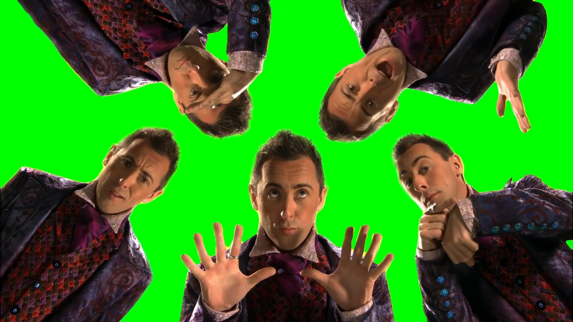 Green Screen Meme Template of Fegan Floop (Alan Cumming) singing ''Who? What? When? Where? and Why?''