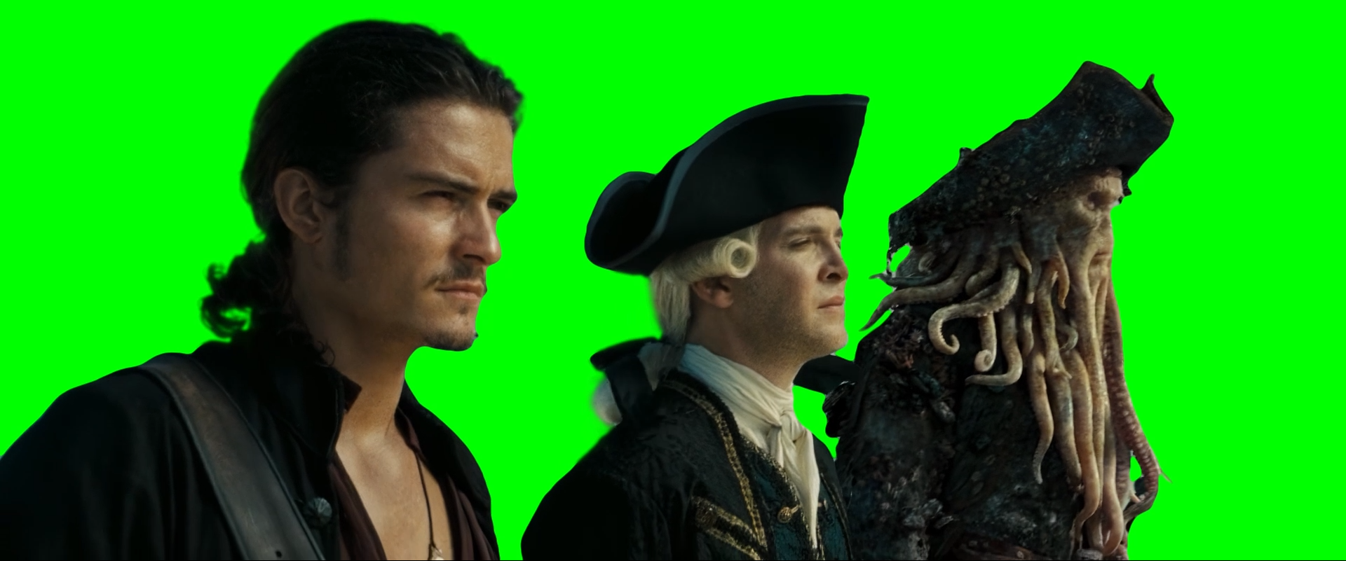 Green Screen Meme Template of Will Turner, Cutler Beckett, and Davy Jones standing together in the Pirates of the Caribbean: At World's End movie