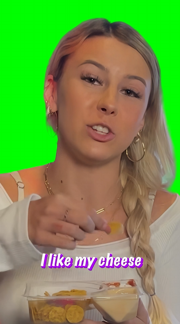 Hawk Tuah Girl saying "I Like My Cheese Drippy, Bruh!" and eating Lunchly meme (Green Screen)